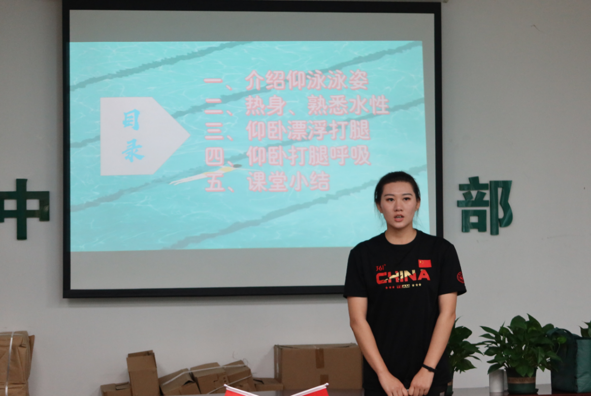 姚佳男老师讲授的主题是“仰泳腿部基础”,她的授课条理清晰,充分展示了扎实的专业技能。
