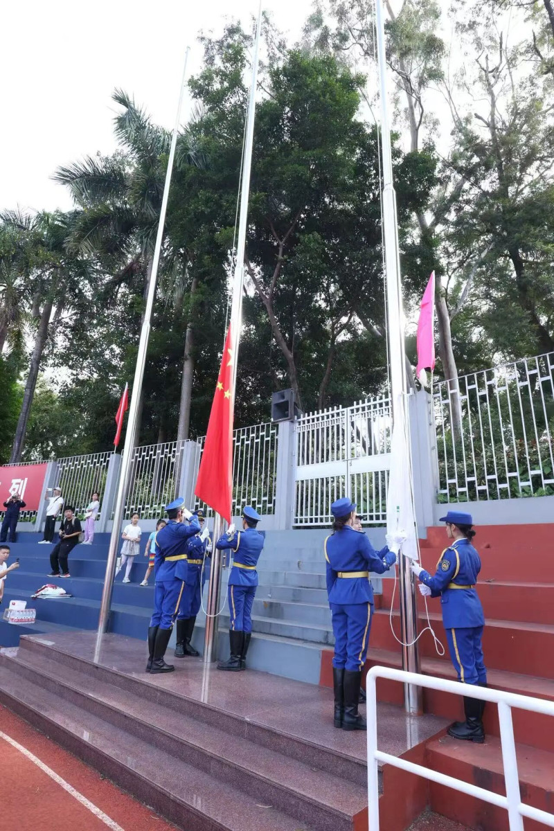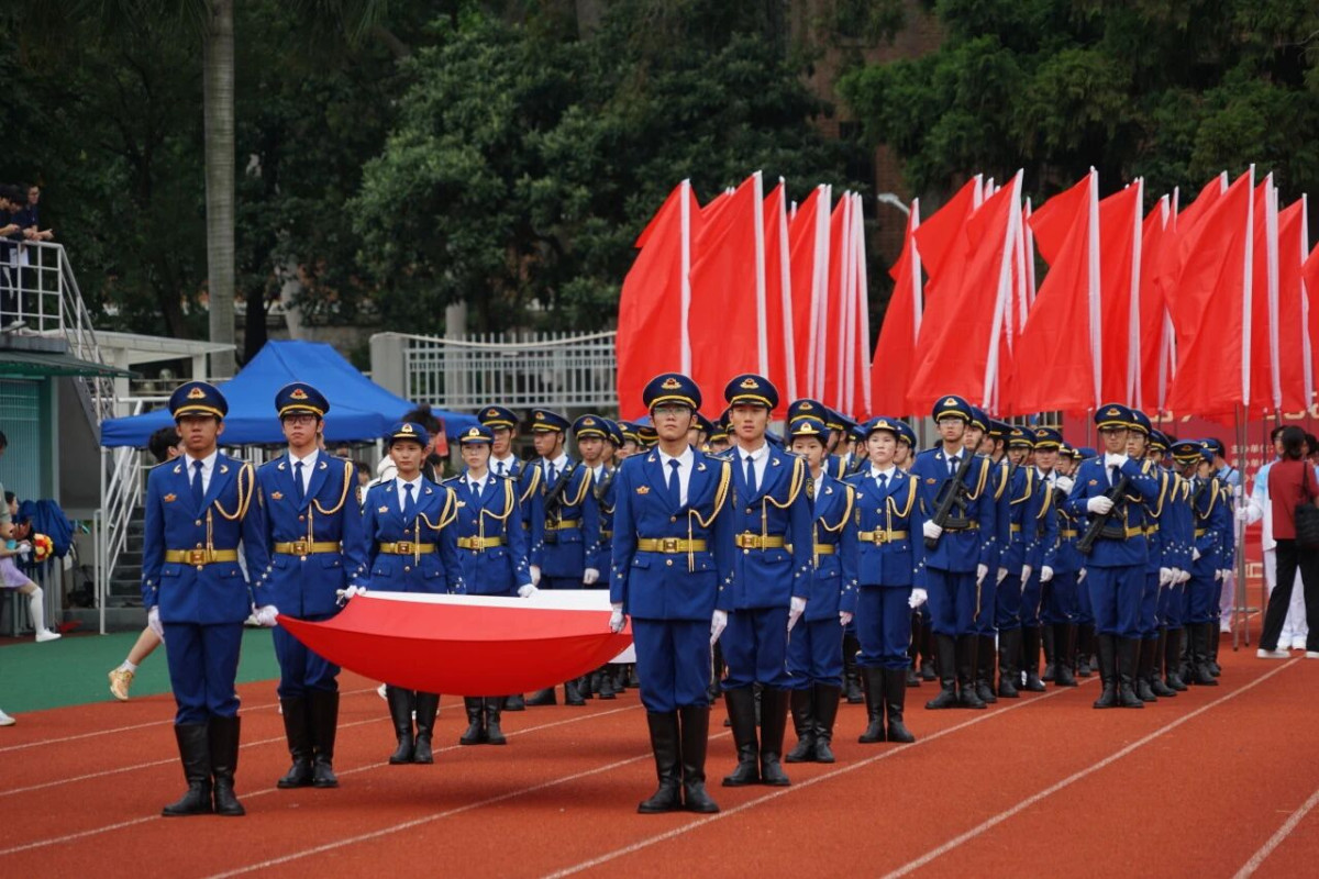 随着雄壮旋律响起,国旗护卫队迈着铿锵有力的步伐率先登场。他们神情庄重,炯炯有神的目光与挺拔的身姿,无不体现着对祖国的赤诚与对国旗、校旗的守护。全场师生自发肃立,行注目礼,在响彻云霄的国歌声中,注视着五星红旗徐徐升起,一股强烈的爱国情怀与集体荣誉感油然而生。飘扬的旗帜既是对学校百年校史的致敬,也是对校训精神薪火相传、历久弥新的生动诠释。