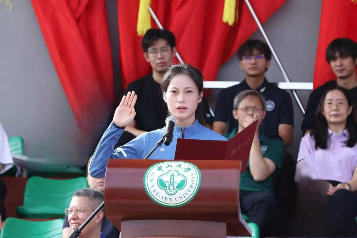 2025年全国田径锦标赛及全国大学生田径锦标赛女子跳远双料冠军、体育部研究生李智双作为运动员代表庄严宣誓。