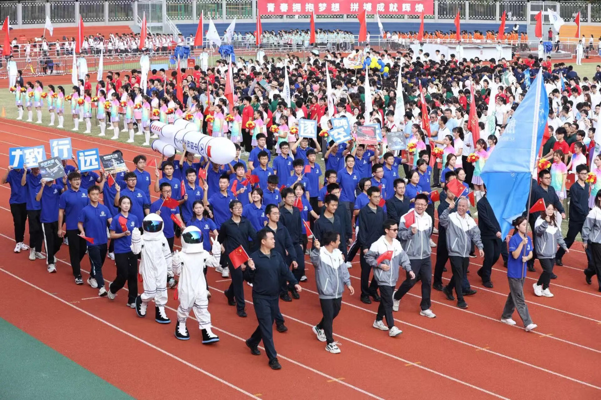 体育场内彩旗猎猎,欢声如潮。来自全校各院系、机关及附属单位的77个参赛方阵,踏着激昂的节拍依次入场。各方阵着装统一,精神抖擞,步伐铿锵有力,口号响彻云霄。有的手持创意展板,凝练专业特色与奋斗誓言;有的变换灵动队形,演绎青春活力与无限可能;有的挥舞特色道具,表达对母校的赤诚与对盛会的礼赞。一道道流动的风景,一个个昂扬的身姿,充分展现了新时代中大学子锐意进取、奋勇争先的精神风貌。